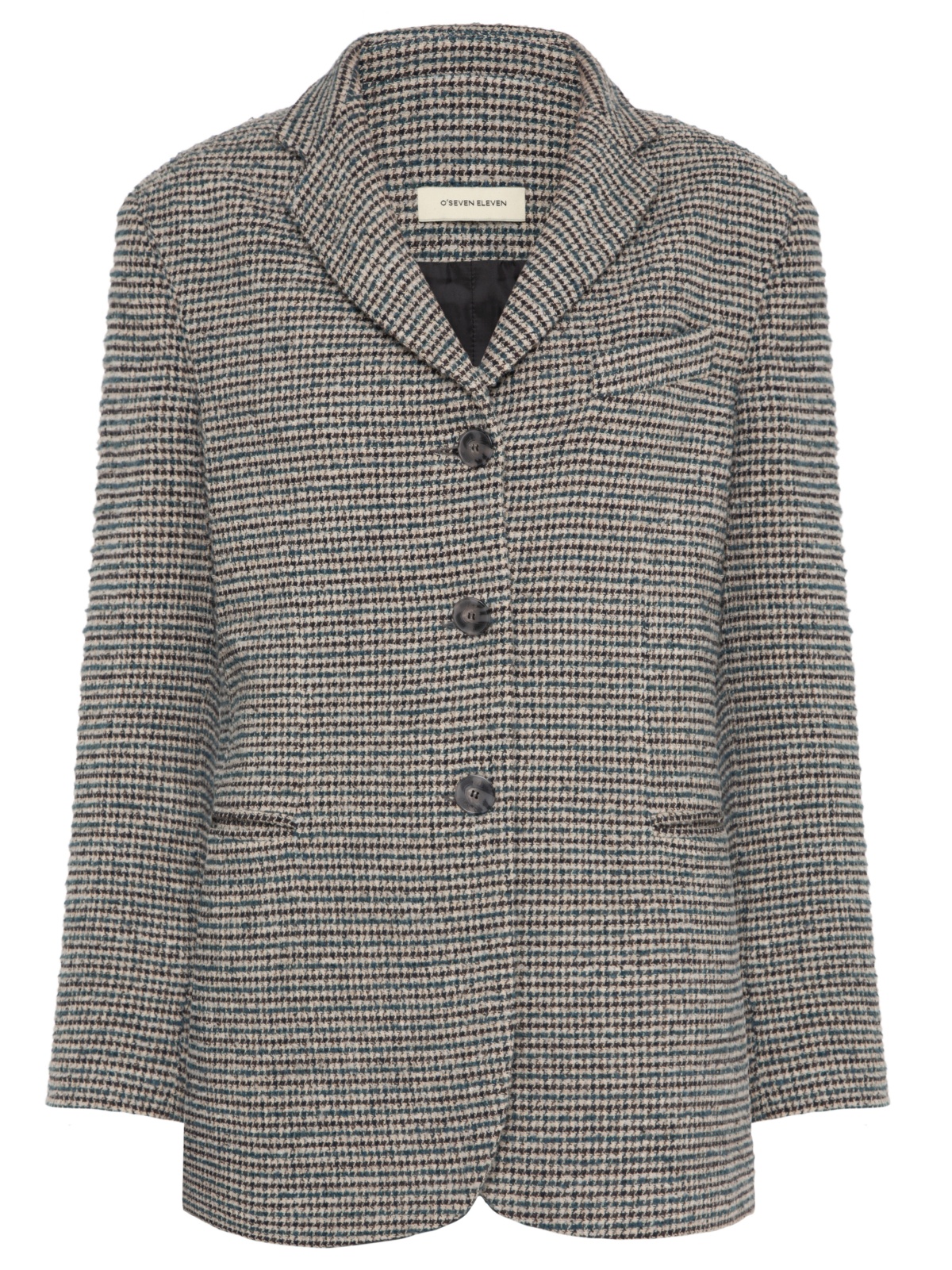 While the silhouette of a grey checked blazer is kept precise, it exudes the tactile feel of a boucle to counterbalance sartorial clarity with texture play. The piece fits slightly oversized to make layering an easy feat and features peak lapels along with slit pockets and single-breasted fastening that opens into a satin-lined interior.