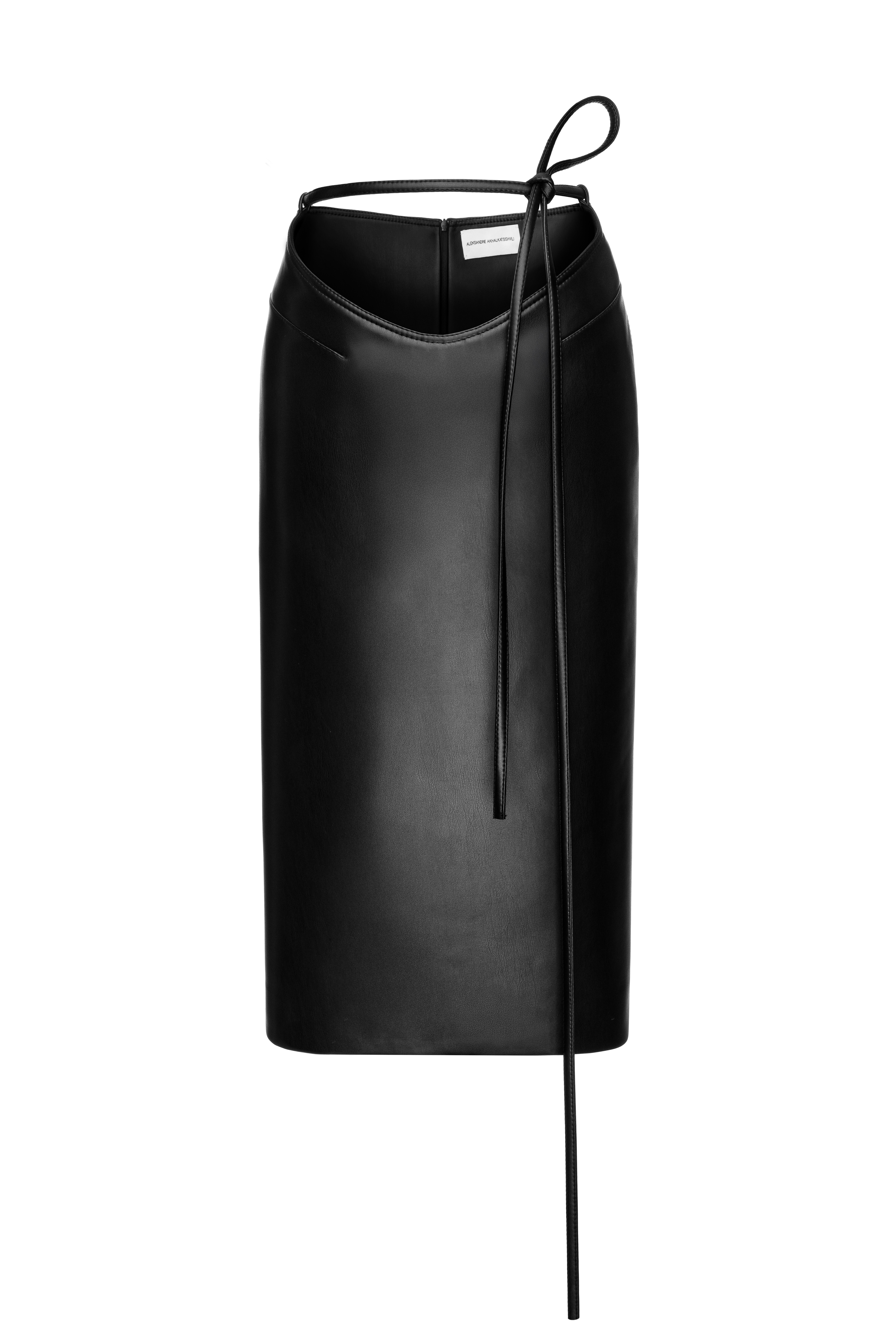 This black mid-rise skirt features slanted side cutouts with self-ties, a concealed back zip, and a back slit that reveals a hint of skin — a signature blend of structure and sensuality from Aleksandre Akhalkatsishvili.