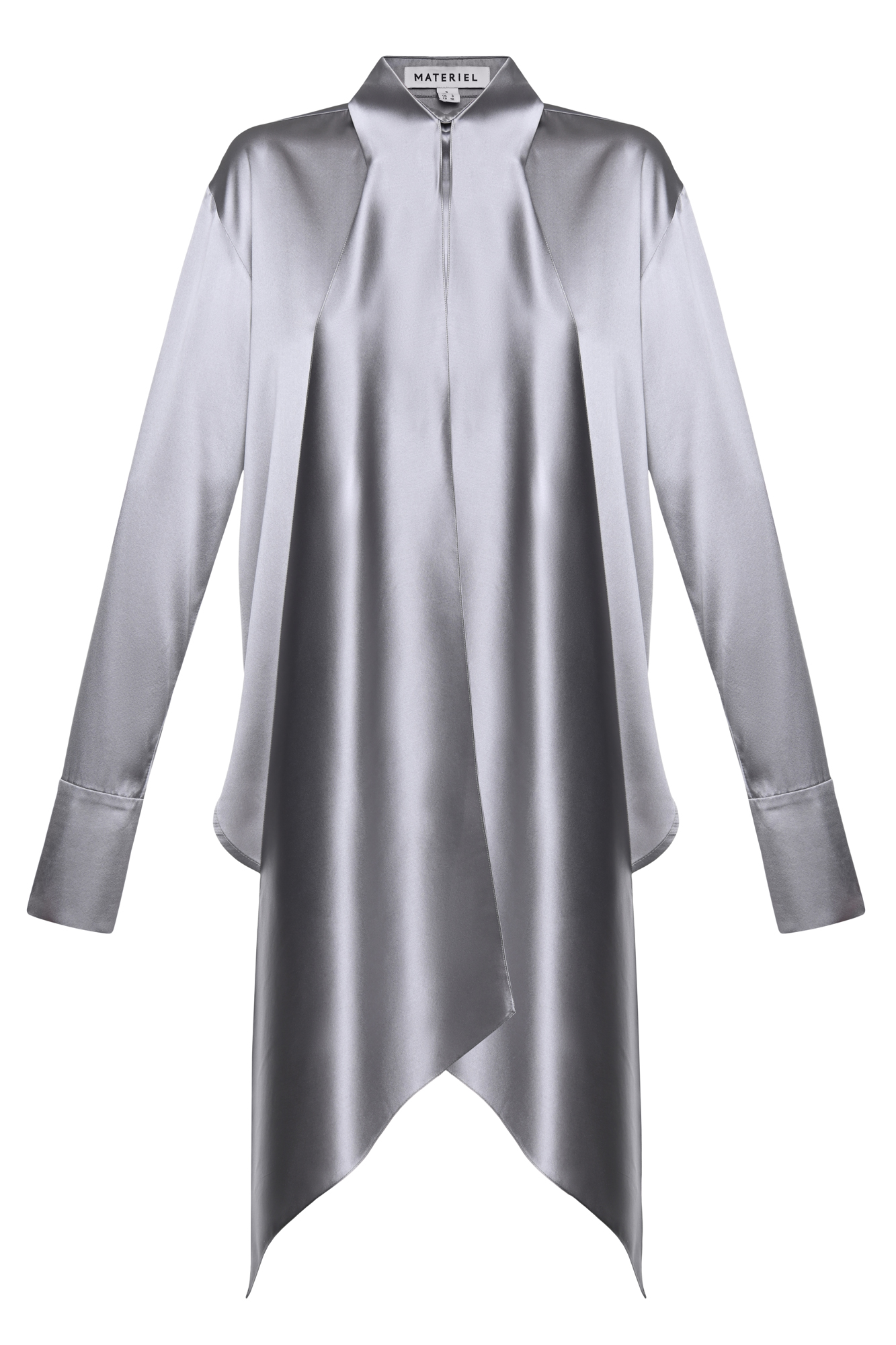Silver silk blouse from Materiel, featuring a flowing silhouette, button details, and a tie-neck scarf for an elegant, airy finish.