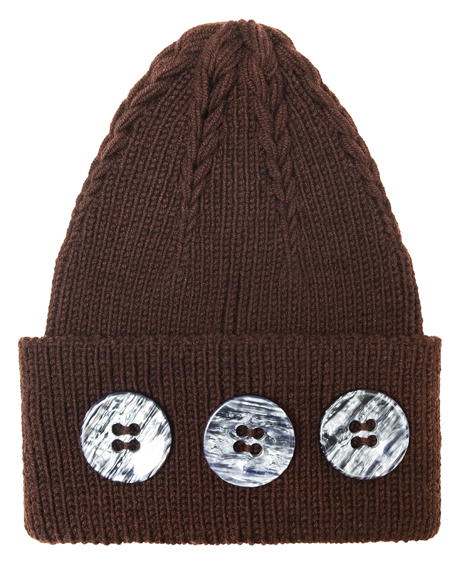 Chocolate rib knit beanie with braided top. Decorated with three oversized grey nacreous buttons.
